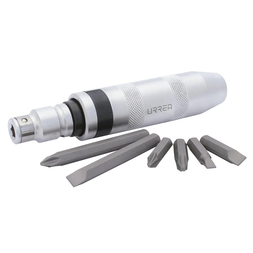 PRECIO EXCLUSIVO DE TIENDA EN LINEAJuego de destornillador de golpe con puntas intercambiables, 8 piezas Urrea, juego de destornilladores de impacto 6 puntas y puntas hexagonales de 5/6″» fabricadas en acero S2. Cuerpo sólido de acero con tratamiento térmico para evitar deformaciones, ideal para aflojar tornillos difíciles de girar, sobre todo aquellos con mucho óxido a su alrededor o con algún pegamento o epóxido