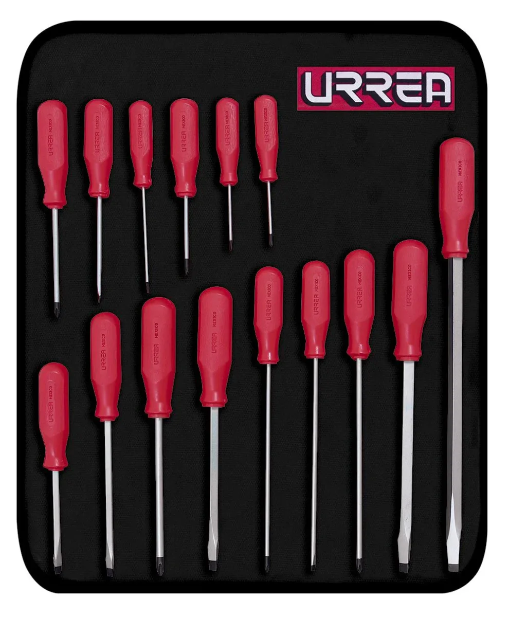PRECIO EXCLUSIVO DE TIENDA EN LINEAJuego de 15 destornilladores con mango rojo, combinados Urrea, punta negra que evita el desprendimiento de material en procesos productivos críticos (industria alimenticia) con diseño ergonómico que proporciona mayor comodidad al agarre. Barra de acero aleado (cromo-vanadio), material conocido como el de mayor calidad para destornilladores.